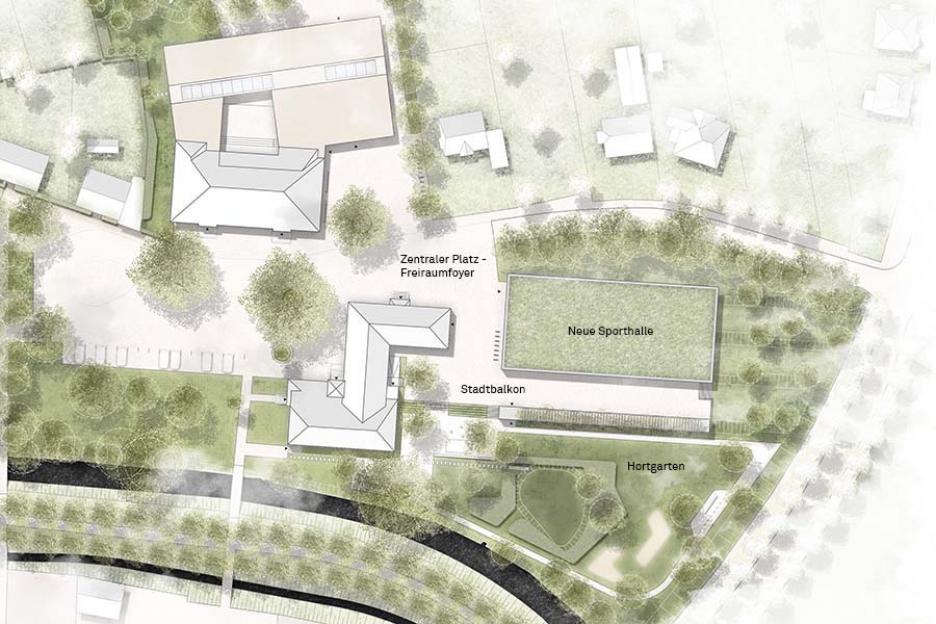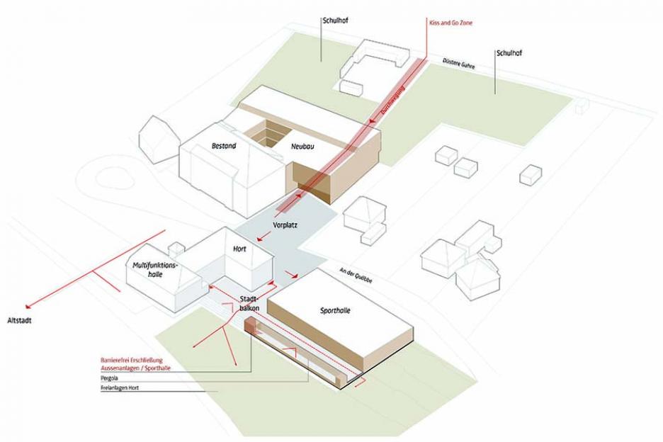 Ein zentraler Platzraum bindet als freiräumliches Foyer die Gebäude zusammen und erschließt die neuen Freiräume - Schulhof, Hortgarten und Schulsportpark. Als Haupterschließung des Geländes dient eine Wegespange, die im Süden an bestehende Verbindungen in die Altstadt anschließt.