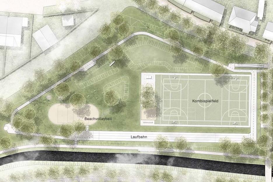 Eine lebendige, fließende Topografie bestimmt den Spiel- und Sportpark. Der umschließende Rundweg dient gleichzeitig als Laufbahn.
