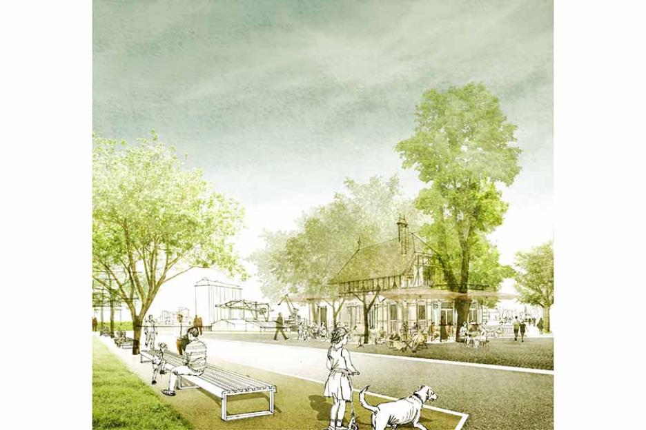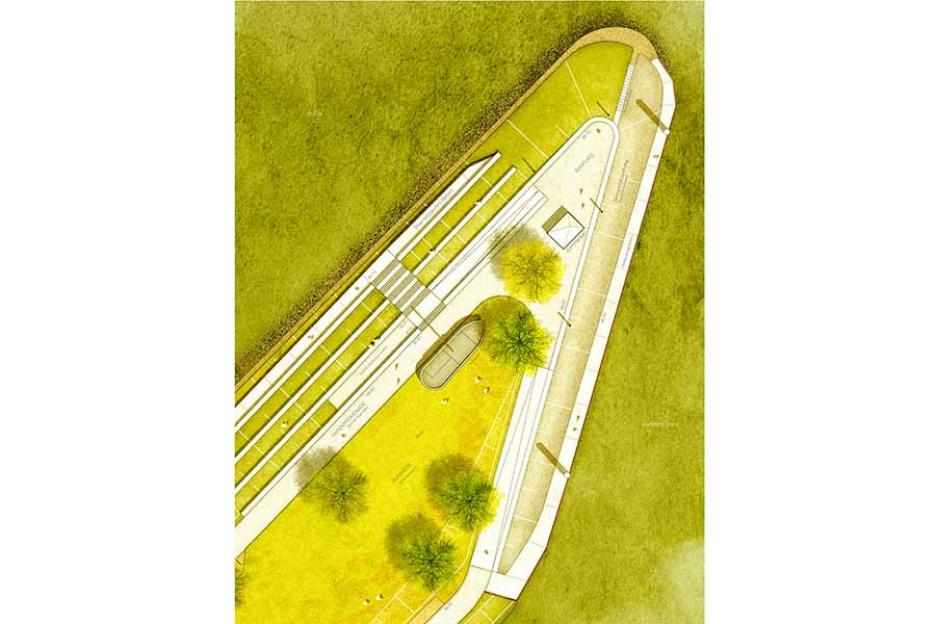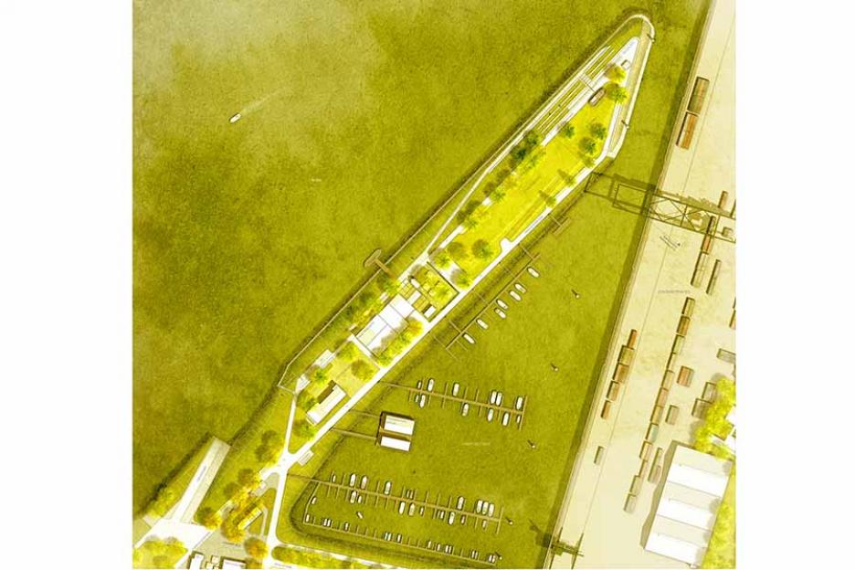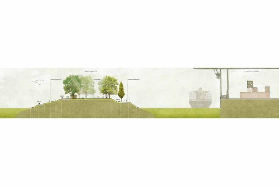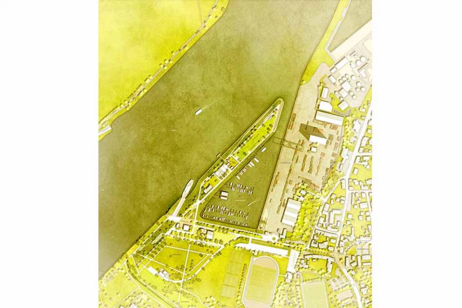 Zwischen Kernstadt und Ufer bildet eine urbane Doppelachse das verbindende Rückgrat. Sie läuft auf den neuen Fährplatz zu, der den Mittelpunkt des neuen Reigens von Orten am Rheinufer bildet. Der Platz fasst den Zugang zur Fähre und das historische Fährhaus und fungiert als Knotenpunkt für das Wegesystem und die Erschließungen des neuen Rheinuferparks. In der angrenzenden Parkspange sind Wohnmobilstellplätze untergebracht, in den Rheinhainen ist Platz zum Picknicken und Spielen mit Blick aufs Wasser und die große Rheinwiese bietet einen offenen Raum in der Tradition des Volksparkes.