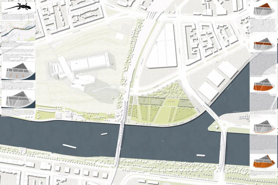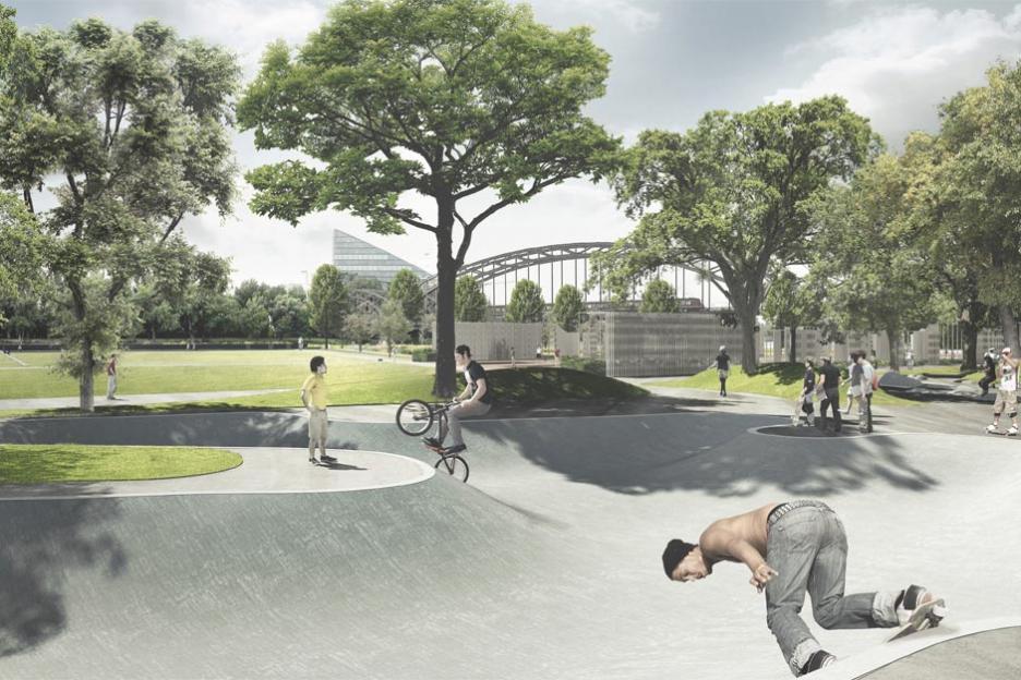 Parkdialektik : Skatelandschaft und Mauereidechse? Der Entwurf reflektiert, wie ein moderner, intensiv genutzter Sport- und Spielpark mit naturnahen Entwicklungsräumen verwoben werden kann. Aus diesen scheinbaren Gegensätzen von quirliger Aktivität und ruhigem Raum, Funsport und Naturerleben entsteht eine atmosphärische und strukturelle Komposition die dem Park seine Eigenart gibt.