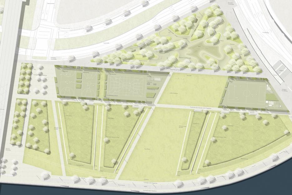Die Grobstruktur des Parks ist großmaßstäblich gedacht: Die Blickbeziehung von der Honsellbrücke zur Frankfurter Innenstadt mit ihrer spektakulären Skyline prägen sich in den Entwurf ein, wie auch der Bezug zur Dominanten des EZB-Hochhauses und später dem Hochhaus an der Hafenmole. Die modular arrangierbaren Großeinheiten der Spielfelder werden zu einem starken Band zusammengebracht, das dieser Grundausrichtung folgt.