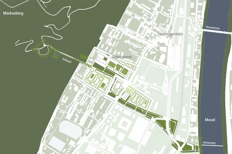 Die bisher stadträumlich vernachlässigte Beziehung zwischen Markusberg und Mosel, auf dem Gelände der ehemaligen Jägerkaserne, wird durch das neue Irrbachquartier als besonderes Gefüge im Stadtraum erlebbar gemacht. Durch die Inszenierung dieser neuen Hauptrichtung werden weite Blicke zu den Eifelhöhen und über das Flusstal der Mosel eröffnet. Prägend für das neue Quartier sind die drei markanten Stadtschollen, welche „quer“ zur bisherigen Baufeldausrichtung liegen. Diese drei Stadtschollen bilden differenzierte Charaktere aus, wodurch sie einerseits ihre eigene Identität erhalten und andererseits eine spürbare Zugehörigkeit zu den jeweiligen Nachbarschaften generieren. Mittels räumlicher Öffnung und Verdichtung formen die baulichen [nbsp]Großfiguren spannungsvolle Folgen von Freiräumen zwischen den Landschaftsräumen der Hänge und des Ufers. Das Rückgrat dieser Raumfolge bildet dabei der neue Irrbach.