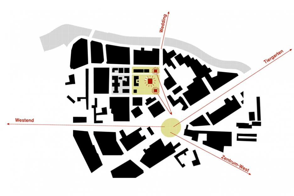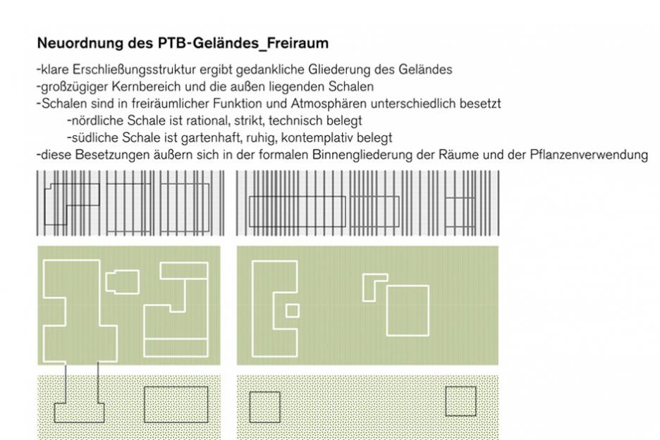 Der Hauptzugang liegt künftig an der Marchstraße, die Blicke durch den Vegetationsbestand werden geöffnet. Zwei geschwisterartige Neubauten an den Grundstücksecken ergänzen das historische Observatorium zum imagebildenden Ensemble. Ausgehend von der neuen Eröffnung an der Marchstraße verklammern zwei kräftige, durchgängige Erschließungsachsen das Institutsgelände. Der Park des Stammgeländes wird als Qualität und als erkennbare Besonderheit der Institution PTB herausgearbeitet. Die Dualität von Stammgelände und Erweiterung wird in der baulichen Entleerung und Verdichtung damit weiter gesteigert: Im Süd-Osten der Park mit Solitären, im Nordwesten die hoch komprimierte Forschungsplatine.