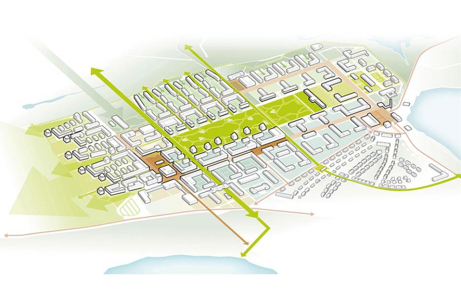 Kompakte Bebauung, attraktive Nutzungsmischungen und der doppelte Freiraumring prägen die urbane Kernzone. Differenzierte Quartiere am Rand leiten mit individuellen Atmosphären zu den Landschaftsräumen über. Die Gesamtstruktur wird von einem attraktiven Freiraumnetz für Fußgänger und Radfahrer durchzogen, welches von der Idee der Durchdringung von Stadt und Landschaft getragen ist.