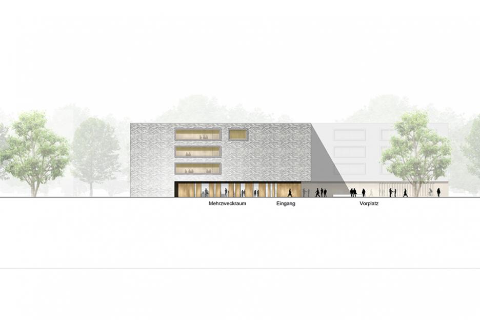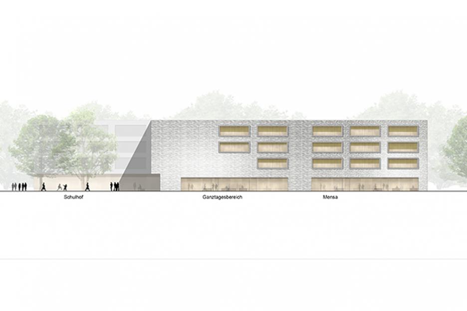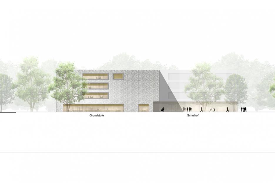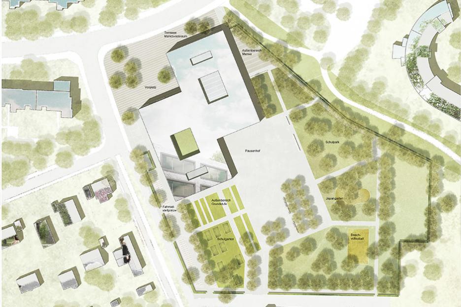 Der viergeschossige Baukörper wird der neue Identifikationspunkt im Quartier. Die differenzierte Kubatur des raumgreifenden Bausteins ermöglicht selbstverständliche Außenräume in einem heterogenen, städtebaulichen Umfeld: Ein Vorplatz im Norden als städtische Adresse und ein geschützter, klar ablesbarer Schulhof im Süden, an den sich weitere Freiraumelemente wie ein Japan-, ein Schulgarten und Sportfunktionen angliedern.