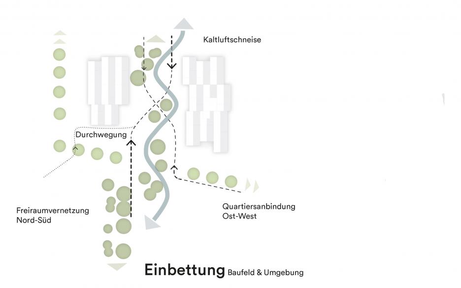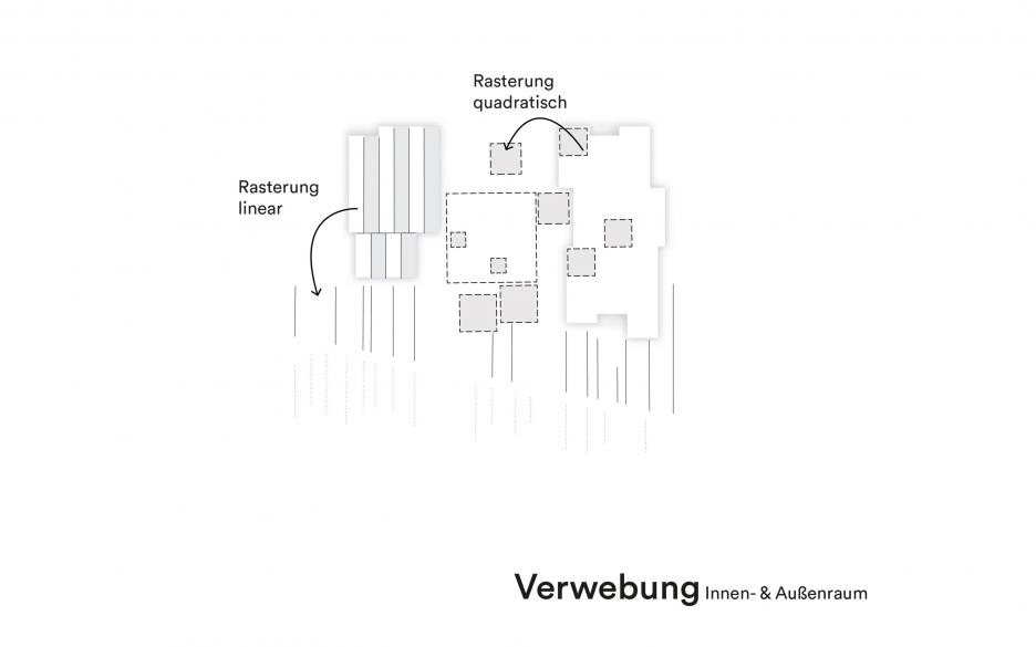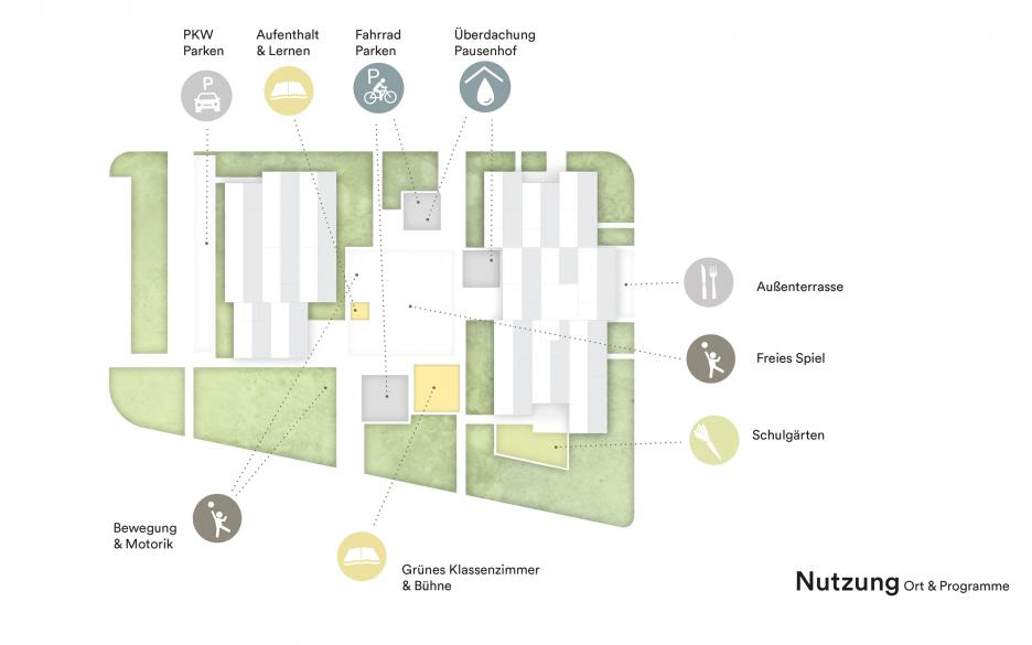 Das aus dem Gebäude adaptierte Raster dient in seiner Formatigkeit als Strukturgeber und prägt den gesamten Freiraum. Darin betten sich sämtliche schulische, pädagogische und betriebliche Funktionsabläufe. Ankunftsorte, Einbindungen sowie robuste Vernetzungen werden klar ablesbar gemacht.