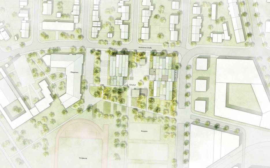Der Schulhof wird als flexibel bespielbarer Baustein auf einer komplexen Stadtplatine begriffen. Eine innere Logik des Hofes wird in ihrer Ausgestaltung mit dem Schulgebäude, der Sporthalle und den heterogenen Nachbarschaften verflochten. Übergreifendes Strukturbild und spezifische Freiraumnutzungen bilden zusammen eine Einheit.