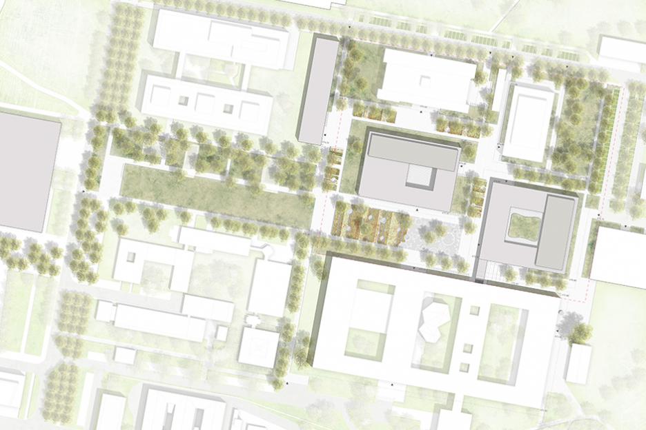 Das Physik-Department der TUM München Im Norden von München ist eines der größten und bedeutendsten Zentren für Physik Europas. Um den Betrieb und die zukünftige Entwicklung zu sichern wurden zwei Neubauten sowie die Modernisierung des Hauptgebäudes Gegenstand dieses Wettbewerbs. Das städtebauliche Konzept entspricht den Anforderungen der Nutzung, Erweiterung und Bestand werden zu einem Cluster verbunden. Das neue Laborgebäude bildet das Gegenüber zur neuen Mensa mit einem dazwischen gespannten Grünbereich, der in einem gemeinschaftlichen Quartiersplatz für das Physik-Departement endet. Das Freiraumsystem bindet das Department mit klaren Gesten an die Primärstrukturen an. Der neue Quartiersplatz ist dabei Abschluss und Kopf der offenen Campusachse. Gleichzeitig begründet er einen markanten Promenadenring um das Hörsaalgebäude.
