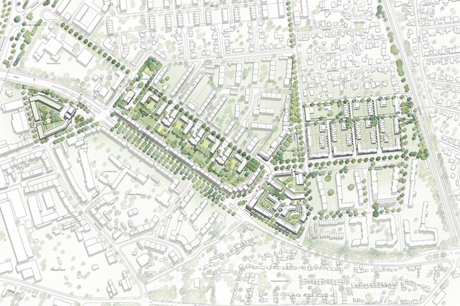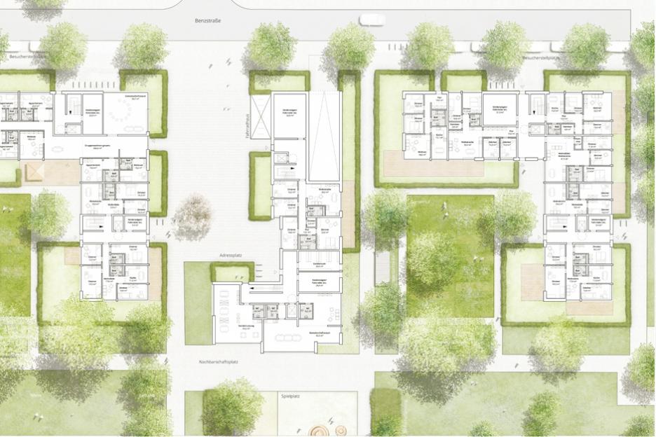 Die dort bestehenden losen Siedlungsstrukturen werden in einen lesbaren Stadtgrundriss mit klaren, öffentlichen Stadträumen eingebunden. Plätze und Stadtgärten rhythmisieren die urbane Raumfolge und bieten eine hohe Aufenthaltsqualität.