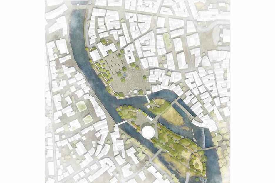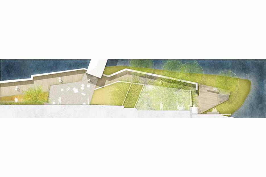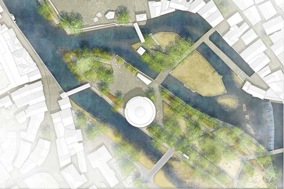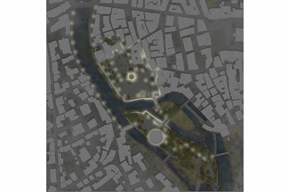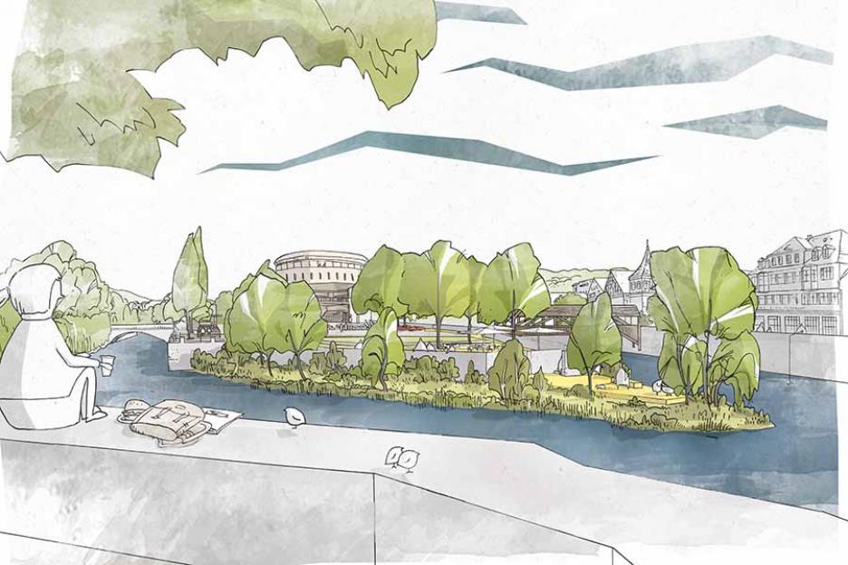 Das Globe Theater wird als Gebäude im Park zwischen Bäumen behandelt, bestehende kleinteilige Details im Inselpark zugunsten eines übergreifenden, landschaftlicheren Bildes zurückgenommen.
