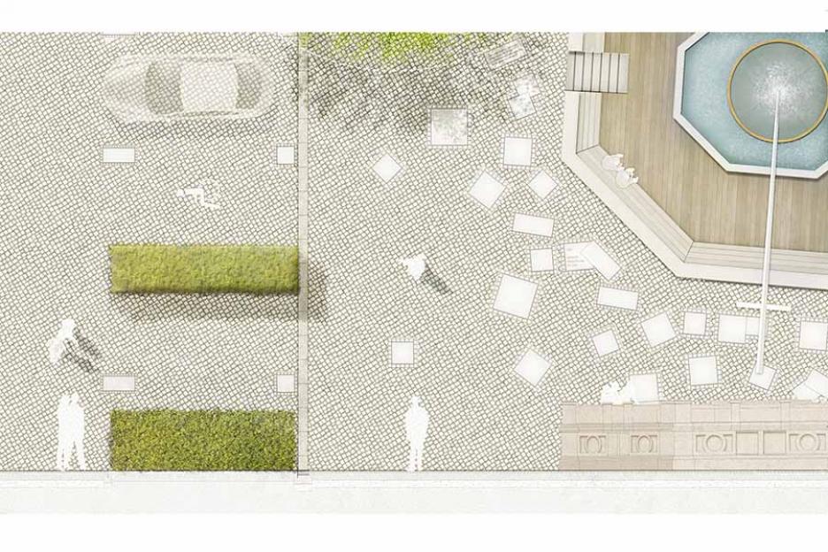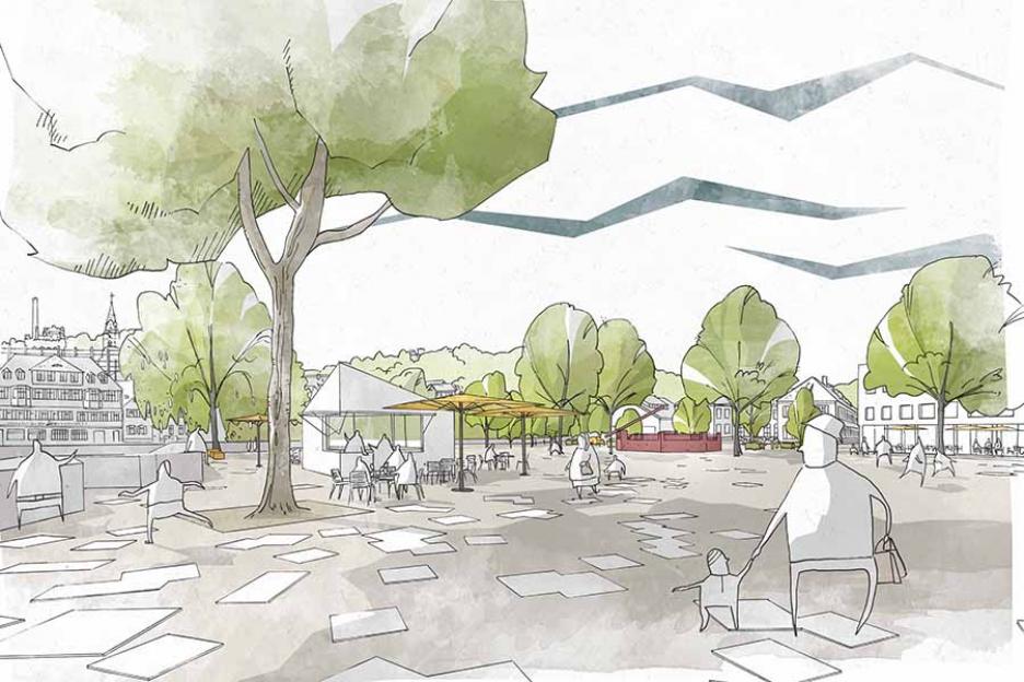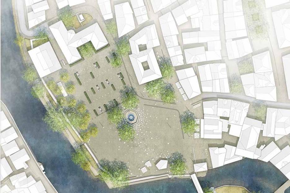 Der weitläufige Haalplatz mit dem historischen Brunnen erhält mit einem Sitzpodest um den Brunnen, dem Baumhain und einem Gastro-Pavillon eine räumliche Differenzierung. Er wird mit seinem steinernen Belag zur urbanen Bühne. Dem wird die Kocherebene als wilder Kontrastraum gegenübergestellt. Gewässer und Gewässerrand sind über Stege hautnah als natürliche Lebenswelt in der Stadt erlebbar.