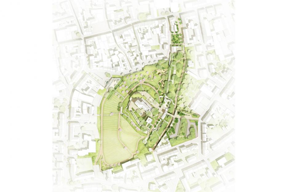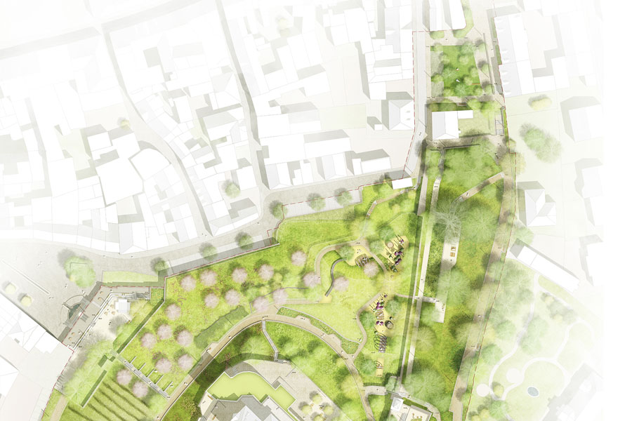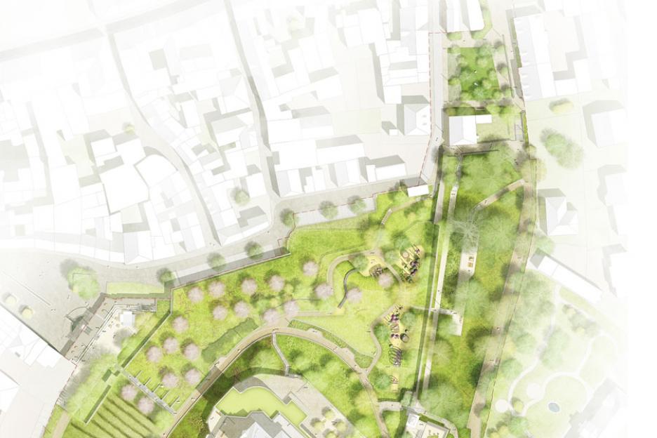 Der Burghof als zentraler Ort der Anlage wird mit einem durchgehenden, hellen Pflasterbelag und einer großen, zentralen Rasenfläche beruhigt.