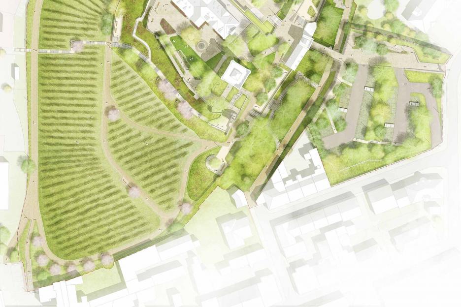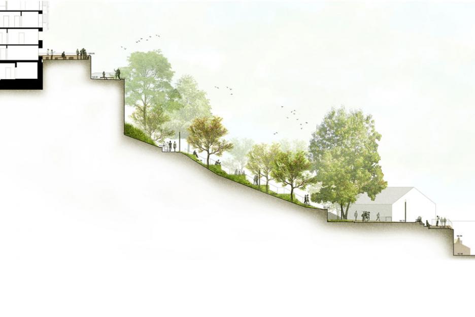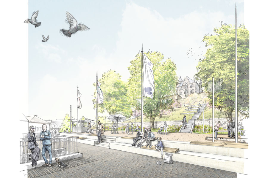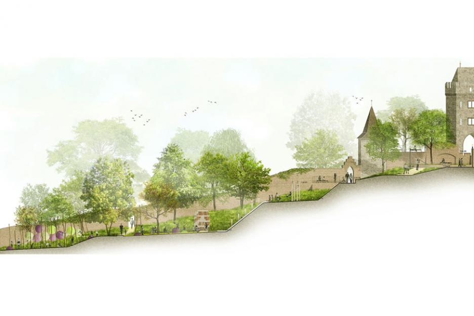 Unterhalb des Burghofes wird die Burgspange zwischen dem abgesenkten Bereich an der Kapelle im Norden und der Riedel Ruhe neu strukturiert. Es entsteht ein Band ganz unterschiedlicher Sitzplätze und Ausblicke, eingebettet in ruhige Pflanzbereiche.