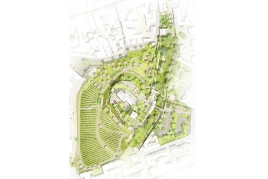 Die Wein- und Obsthänge am Burgberg werden zum verbindenden, sinnlichen Motiv der behutsamen (Weiter-)Entwicklung der Freiräume. Mit der neuen, barrierearmen „Weinschleife“ entsteht ein auf den Bestand abgestimmtes Wegenetz, das durch abwechslungsreiche Vegetationsräume zu neuen Spiel- und Aufenthaltsorten führt, mit immer wieder eindrucksvollen Aussichten über Bingen bis in den Rheingau und das Mittelrheintal.