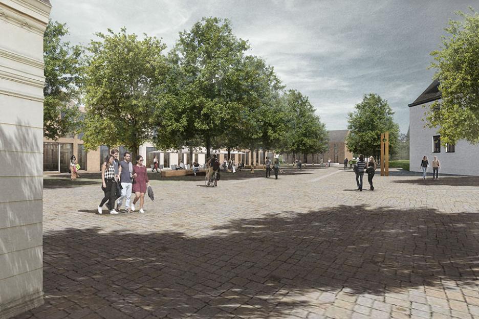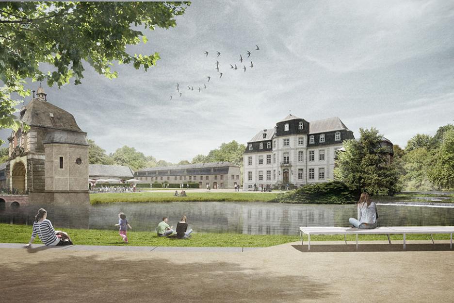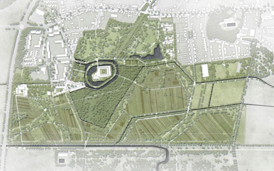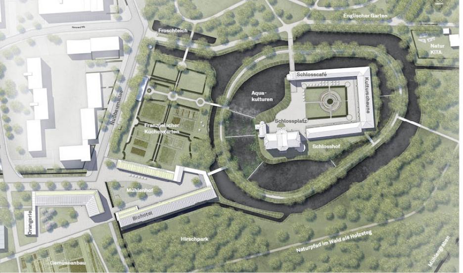 Eine weitläufige Park-, Garten- und Weidelandschaft, die von den Anwohnern mit gepflegt und bewirtschaftet werden kann, verzahnt Schlossareal und Stadt. Neubauten am Mühlenhof und am Platz an der Apsis schaffen prägnante Zugangssituationen zur Parklandschaft.