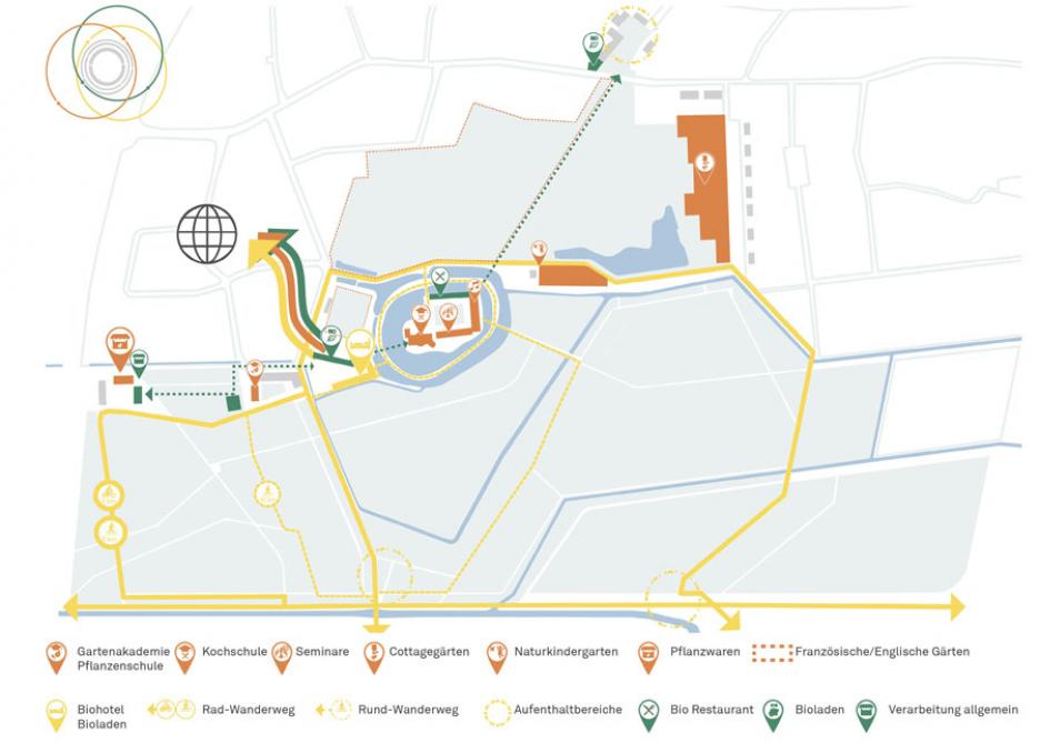 Mit Demeter-Landwirtschaft und Hofladen, Café und Biohotel, Gartenakademie und Kulturscheune entsteht ein permakulturelles Modellgut, das Produktion und Konsum, Arbeiten und Freizeit, Natur und Technik vereint und so auch in einen Austausch mit den Kreisläufen der „Außenwelt“ tritt.